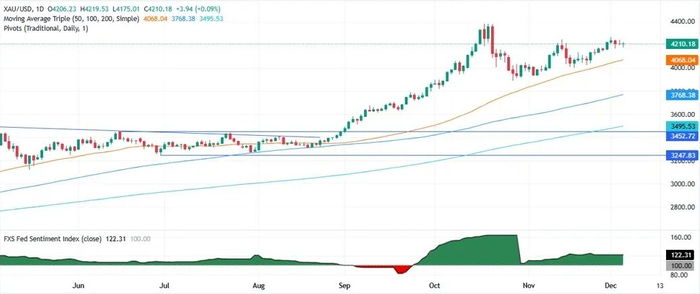 FXStreet分析师Christian Borjon Valencia指出,黄金价格依然偏向上行,日线收盘价高于4200美元/盎司,为金价上涨奠定基础。相对强弱指数 (RSI) 仍呈看涨趋势,但略有趋于平缓,表明市场可能处于盘整阶段,交易员正在等待新的催化剂。